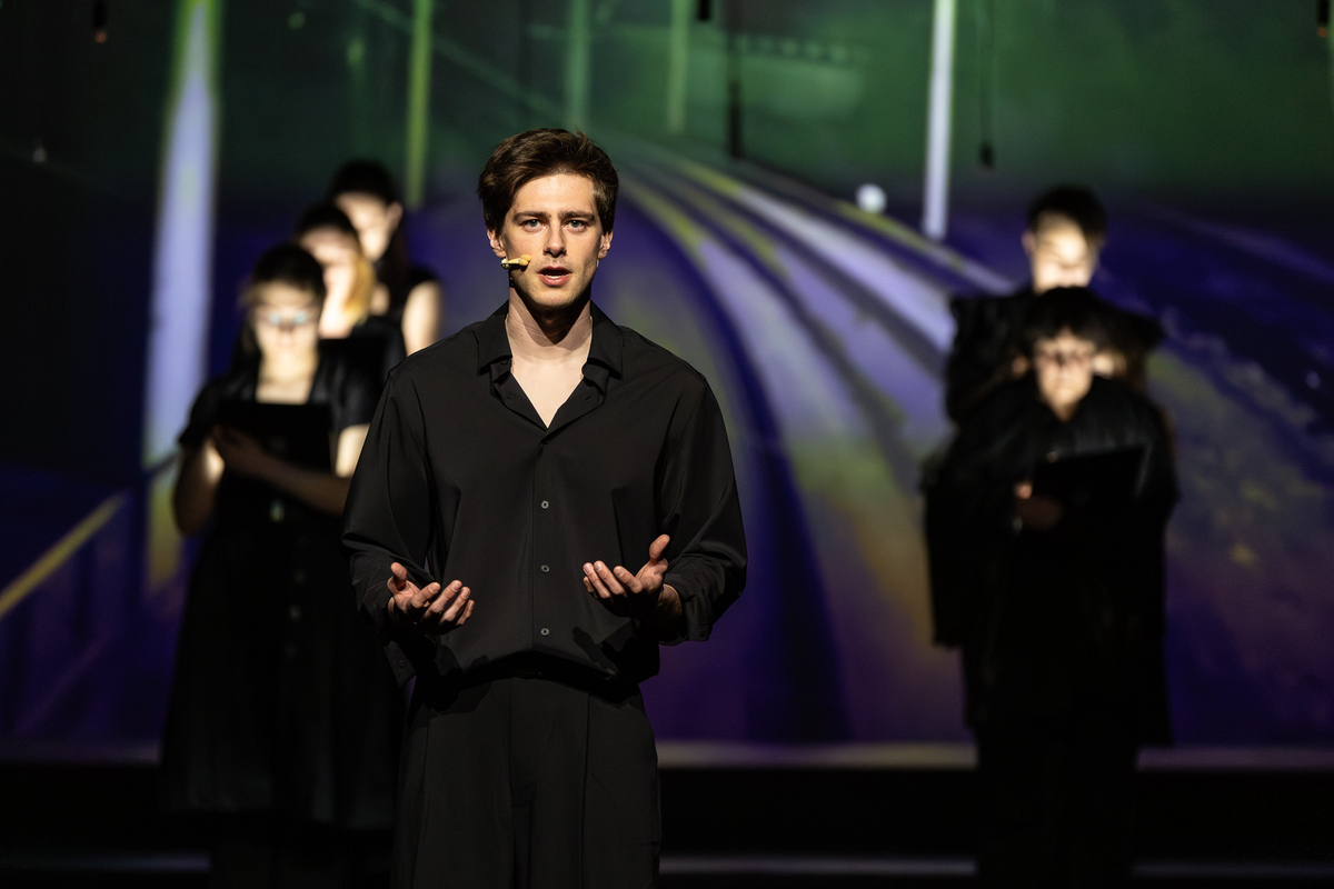 »Vlak, ki drvi v bodočnost, je neusmiljen. Zažaritve podob in zadonitve zvokov Človeka in Družbe skozi Čas so vseprisotne. In vendar jih ne vidimo, ne slišimo. Ne dojamemo, da se je vse to nekomu, nekoč, nekje že zgodilo. Iz množice silhuet, iz disharmonije slišimo glas. Jasen, iskren glas. Kdo je to? V dušah oblikuje novo življenje. Je človek in kliče človeka. Čas, v katerem živimo, je resen in krut. Je čas izkoriščanja strahov. Smo pasivni in vendar hlastamo po upanju. Novi človek gradi novo družbo bodočnosti. Najti moramo tega človeka, vsak v sebi in vsi skupaj.«