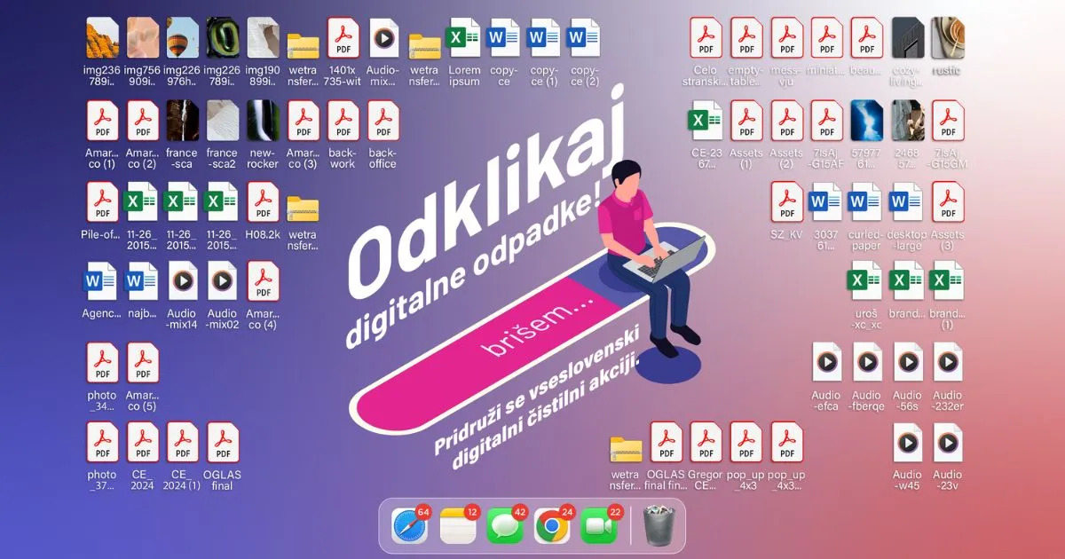 Akcija Očistimo Slovenijo digitalnih odpadkov, ki se letos prične s 14. marcem, spodbuja posameznike, organizacije in podjetja, da iz svojih naprav izbrišejo nepotrebne datoteke, aplikacije, fotografije, videe in e-poštna sporočila ter s tem zmanjšajo svoj digitalni odtis.