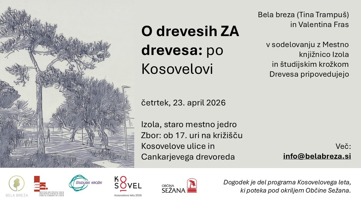 Na dogodek vabijo Bela breza (Tina Trampuš), Valentina Fras, Mestna knjižnica Izola in študijski krožek Drevesa pripovedujejo.