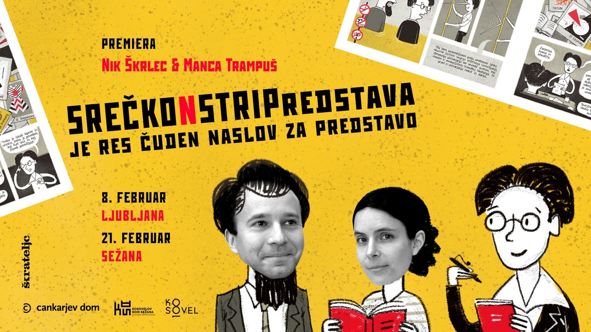 Po motivih stripa SREČKONSTRIP (Škrateljc, 2025) avtorjev Žige X Gombača in Jake Vukotiča je v sklopu Kosovelovega leta 2026 nastala uprizoritev SREČKONSTRIPredstava je res čuden naslov za predstavo, ki Kosovela uporabi kot izhodišče za interaktivni gledališki dogodek. Skozi preigravanje forme intervjuja, podkasta, dialoga in pripovedovanja nastopajoča postopoma opuščata fiksno strukturo ter vabita občinstvo v soustvarjanje vsebin, tem in celo naslova predstave. Meja med Kosovelom, Manco in Nikom, med odrom in avditorijem ter med realnostjo in domišljijo se zabriše, v ospredje pa stopi skupnost gledalcev kot ustvarjalni subjekt.
