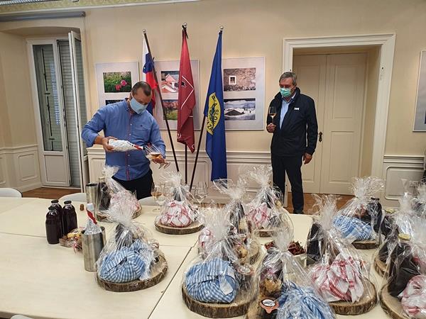 Dobrovoljni chef Peter nas je na Občini Sežana obiskal sredi sončnega sredinega dopoldneva in nas razveselil s čudovito aranžiranimi »kraškimi culami«, ki so vsebovale odličen domači sadni sok, dišečo grozdno marmelado ter božanske doma pripravljene testenine, za posladek pa še slastne polnjene piškote. Seveda je Peter poskrbel tudi za zdravico, s katero smo si zaželeli predvsem veliko zdravja in obilo poguma, da bi skupaj zmogli premagati tudi to težko in nepredvidljivo preizkušnjo.