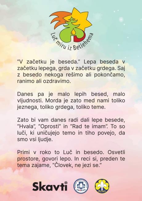 Plamen Luči miru iz Betlehema predstavlja mnogo več kot le svetlobo in toploto, saj s seboj prinaša pomembno sporočilo. Letos nosi geslo »Človek ne jezi se«, kot vsako leto pa ga spremlja tudi poslanica.