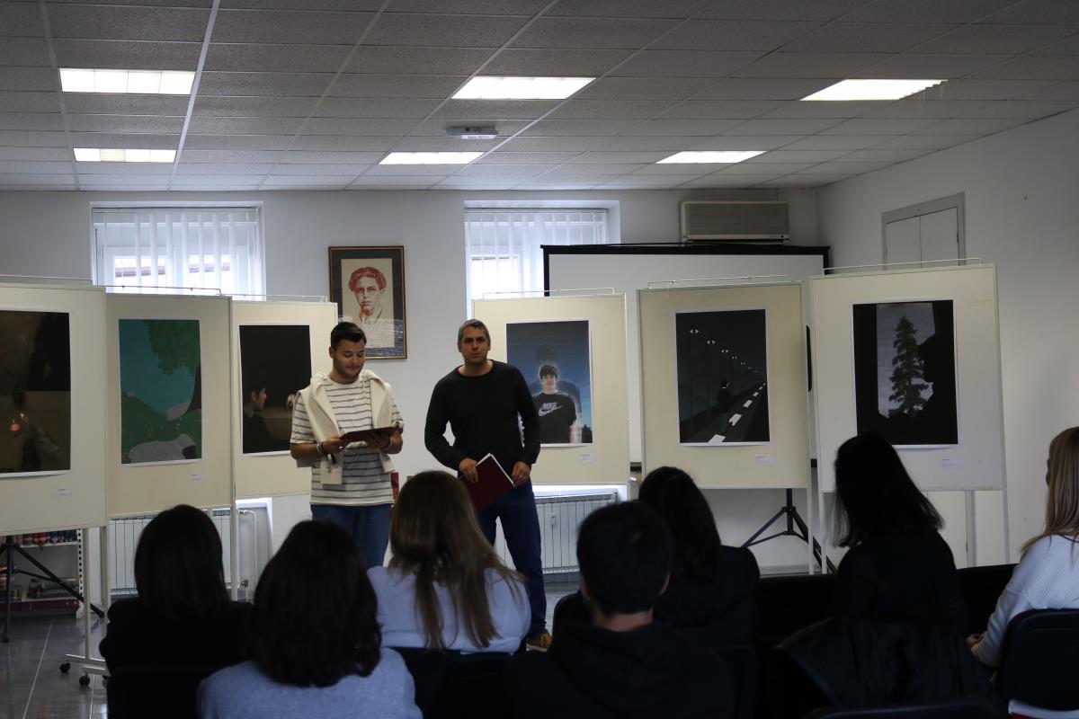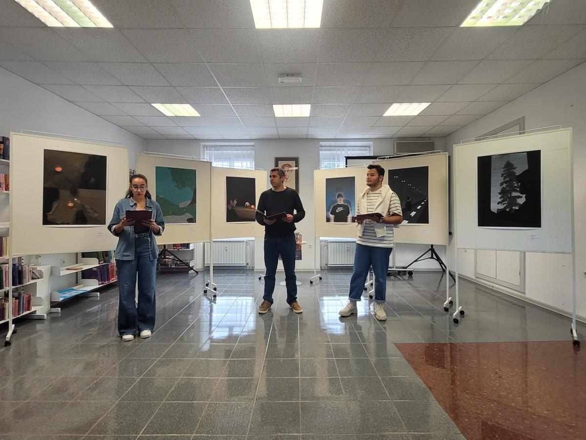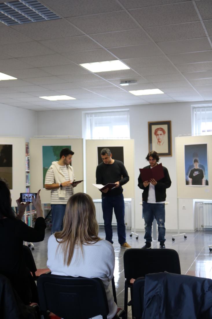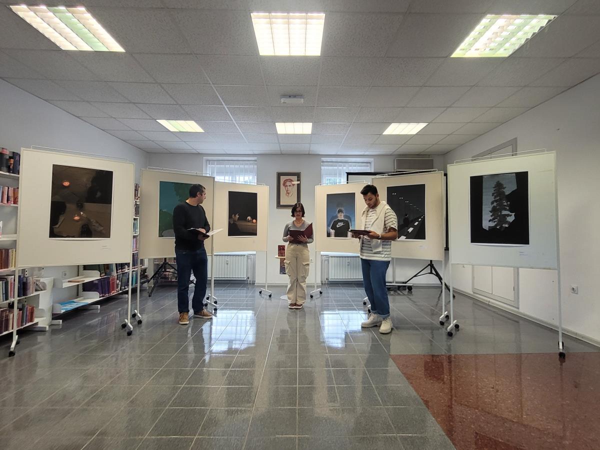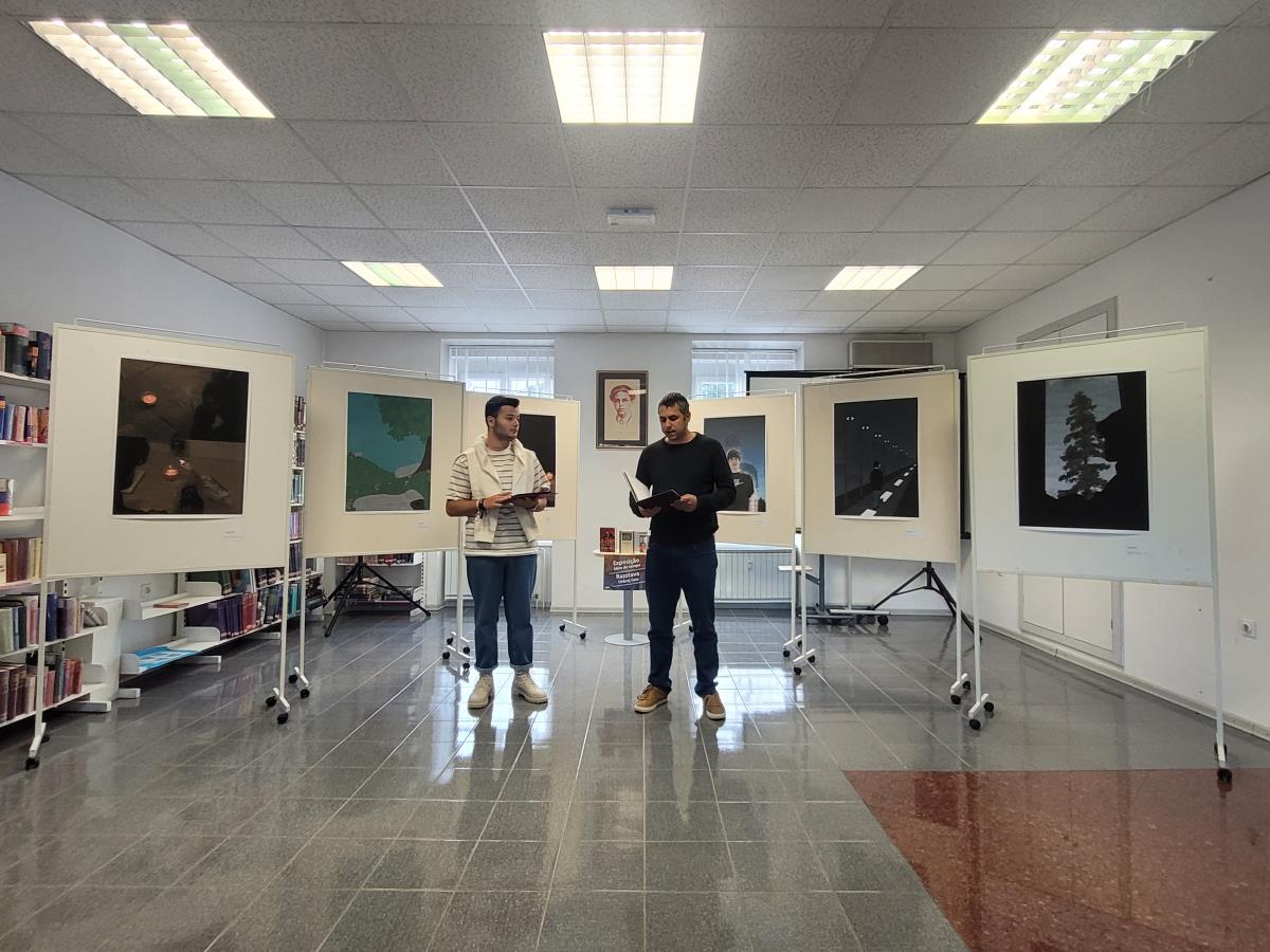 Skupina sedmih portugalskih dijakov, ki letošnjo pomlad tri mesece prebiva v Sežani v okviru programa Erasmus, je na pobudo Kosovelove knjižnice Sežana pripravila razstavo ob prebiranju poezije portugalskega pesniškega velikana Fernanda Pessoe in slovenskega Srečka Kosovela. Izbrali so si tri pesmi vsakega pesnika in jih interpretirali s fotografijo ali grafično ilustracijo. Otvoritev razstavljenih fotografij in grafik je bila včeraj, 17. aprila v knjižnici. Otvoritev sta povezovala eden izmed dijakov Marco André Ferreira Fernandes in direktor knjižnice Marko Matičetov. Podala sta razlago vsake izmed razstavljenih fotografij in grafik, dijaki, avtorji umetniških del, pa so pesem, ob branju katere sta bili fotografija ali grafika izdelani, prebrali. Po vrstnem redu svojih razstavljenih del so pesmi brali: Luana Cardoso, Inês Correia in Andreia Correia, ki so ustvarile grafike in fotografije ob poeziji Fernanda Pessoe. Naslednji trije, ki so ustvarjali ob branju poezije Srečka Kosovela, pa so bili Gonçalo Machado, Susana Ferreia in Tomás Silva. Direktor knjižnice je vsako pesem Fernanda Pessoe prebral tudi v slovenskem prevodu, Kosovelovo pa v slovenskem izvirniku. Dogodek v knjižnici je lep izraz medkulturnega sodelovanja in prepletanja različnih umetnosti.