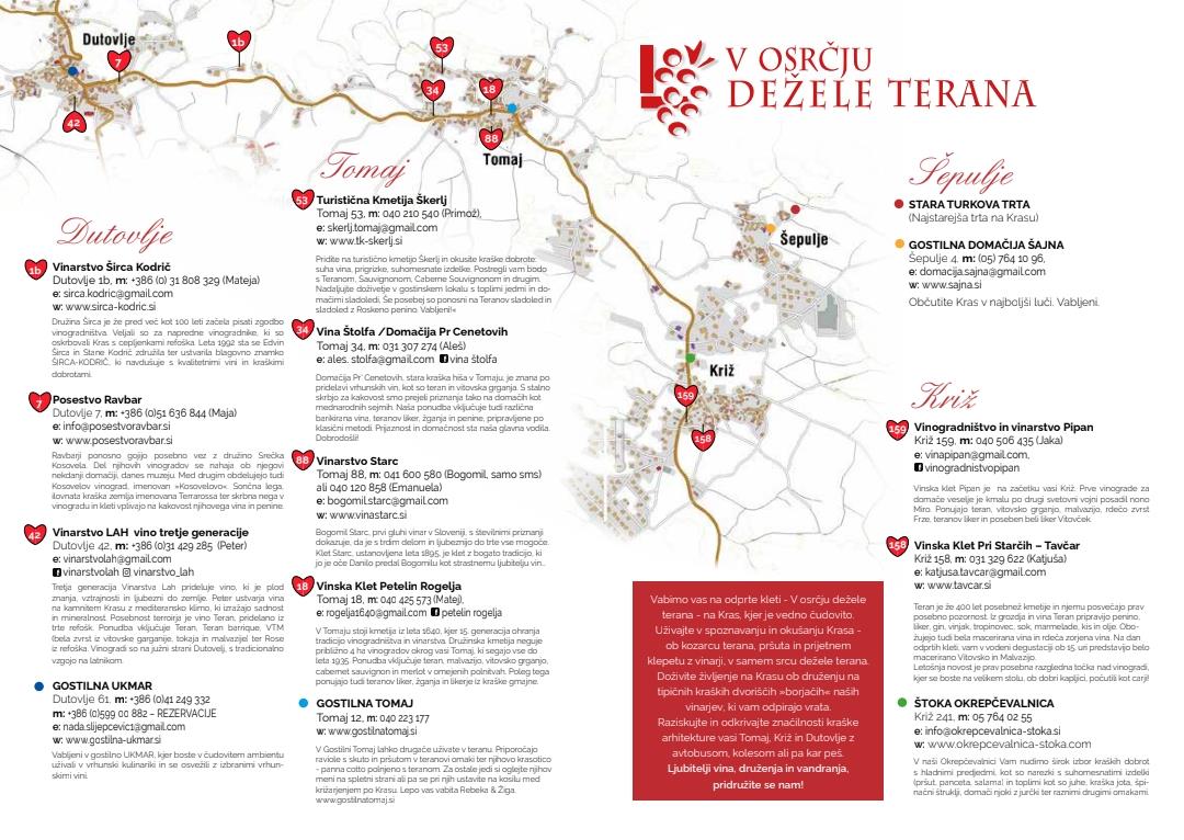 Spoznajte in okusite Kras ob kozarcu terana in klepetu z vinarji. Doživite življenje na Krasu ob druženju na tipičnih kraških dvoriščih, »borjačih«, naših vinarjev, ki za vas odpirajo vrata. Podajte se peš ali s kolesom na raziskovanje in odkrivanje značilnosti kraške arhitekture in vasic Dutovlje, Križ In Tomaj.