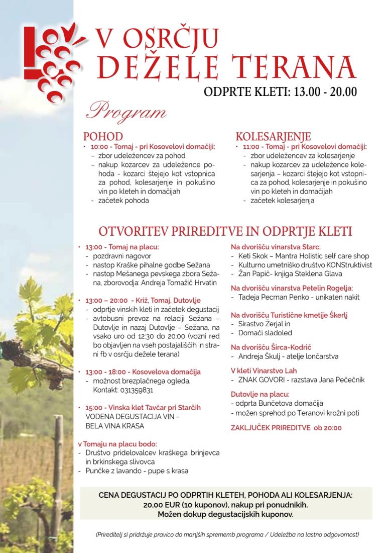Ob 13. uri se bodo z nastopom Kraške pihalne godbe Sežana in Mešanega pevskega zbora Sežana tudi uradno odprle kleti v Dutovljah, Križu in Tomaju. Poleg vrhunskih vin, gostoljubja in dobrot, ki jih nudijo sodelujoči vinarji, se bodo na dvoriščih predstavljali tudi lokalni ustvarjalci in obrtniki, možen pa bo tudi brezplačen ogled Kosovelove domačije v Tomaju.